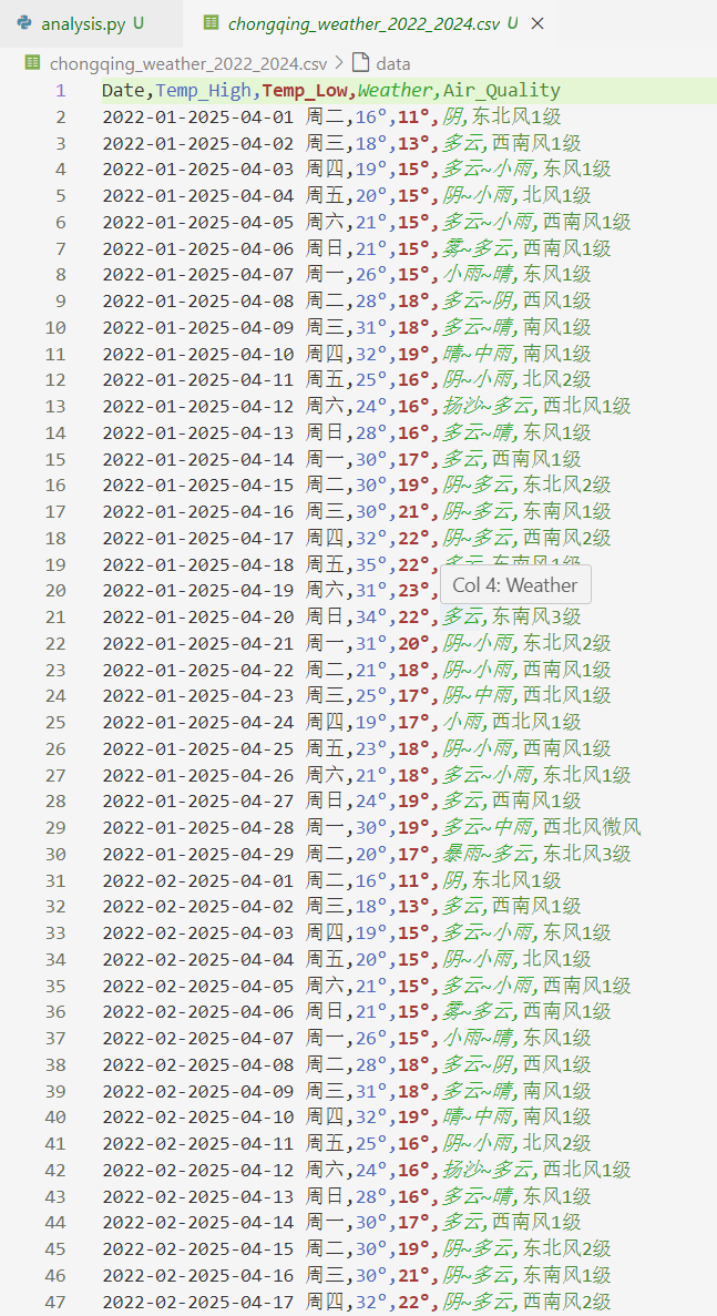 tianqi.2345.com爬取重庆2022-2024年的天气数据,包括日期、最高温度、最低温度、天气状况和空气质量。 - 数据保存为CSV文件,使用