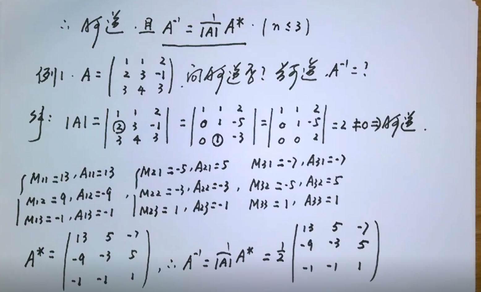 这个公式因为要求了|A|不为0,也即A可逆的时候才可用于求逆矩阵,并且手动求不宜超过三阶,否则计算不现实