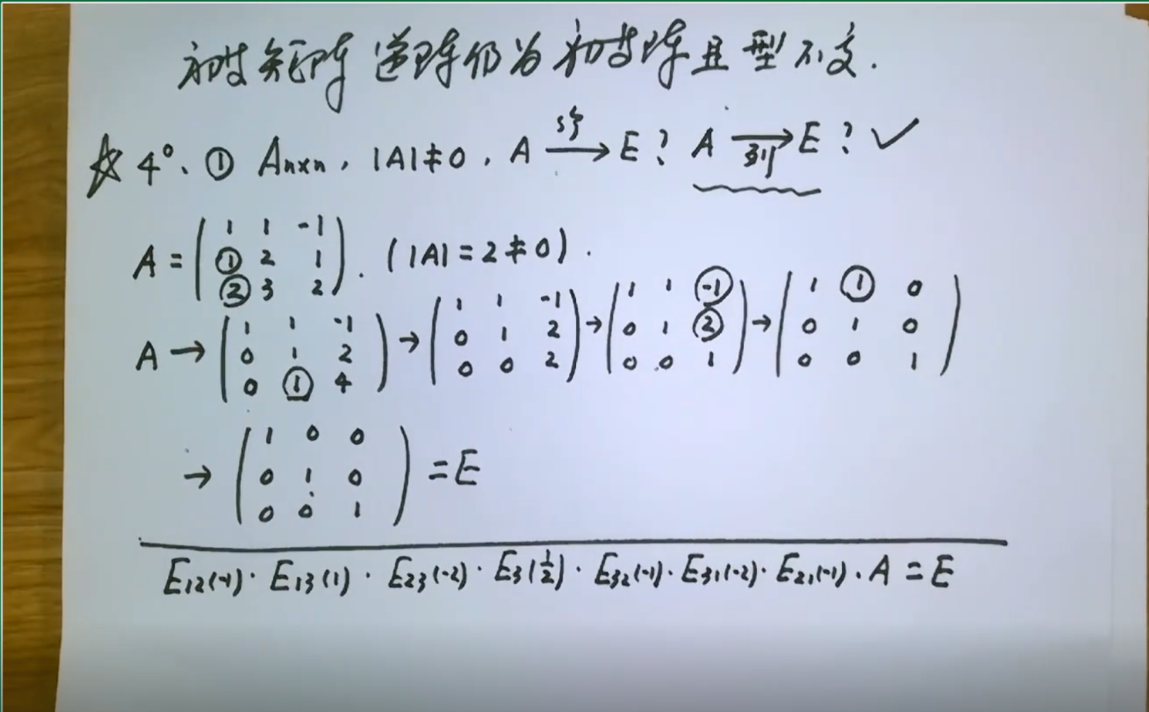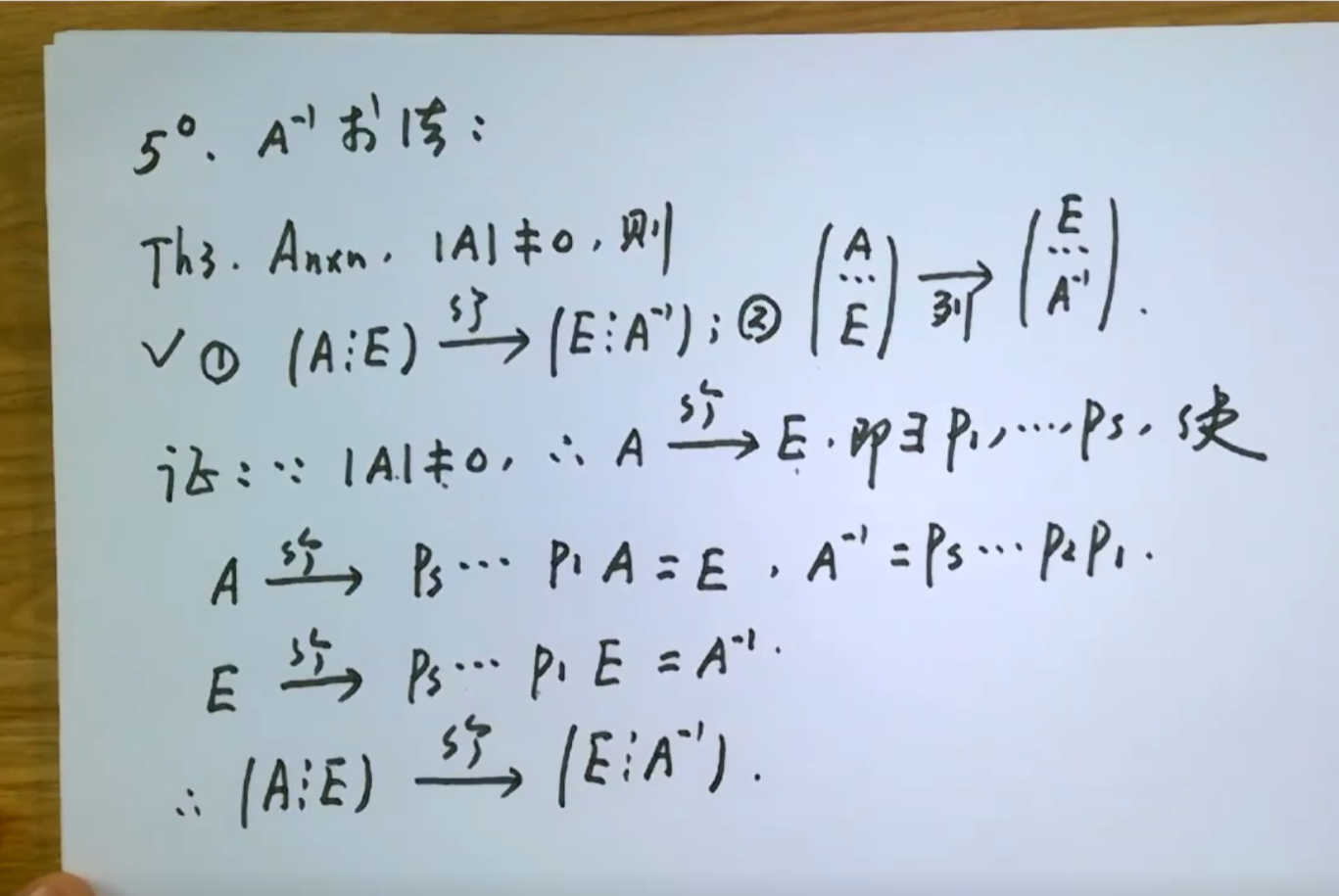 回顾 左行 右列 ,三种类型初等矩阵 I交换两行 逆阵再次交换两行 ;II某行k倍 逆矩阵为 1/k倍; III i行k倍加到j行 逆矩阵为 -k倍