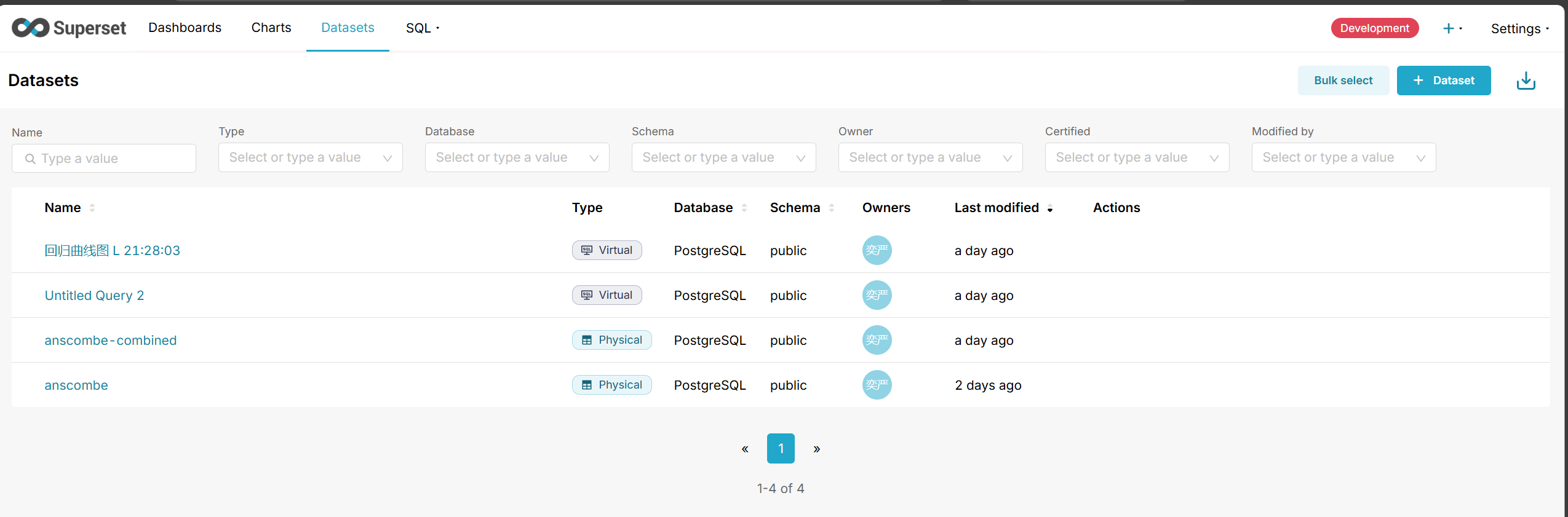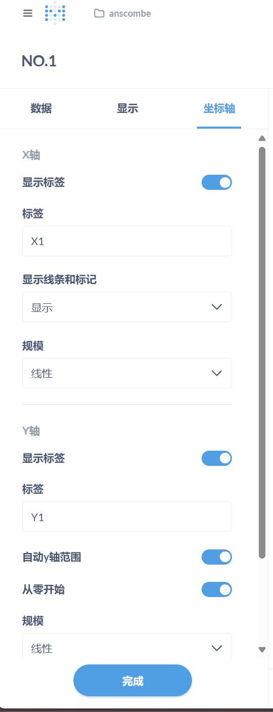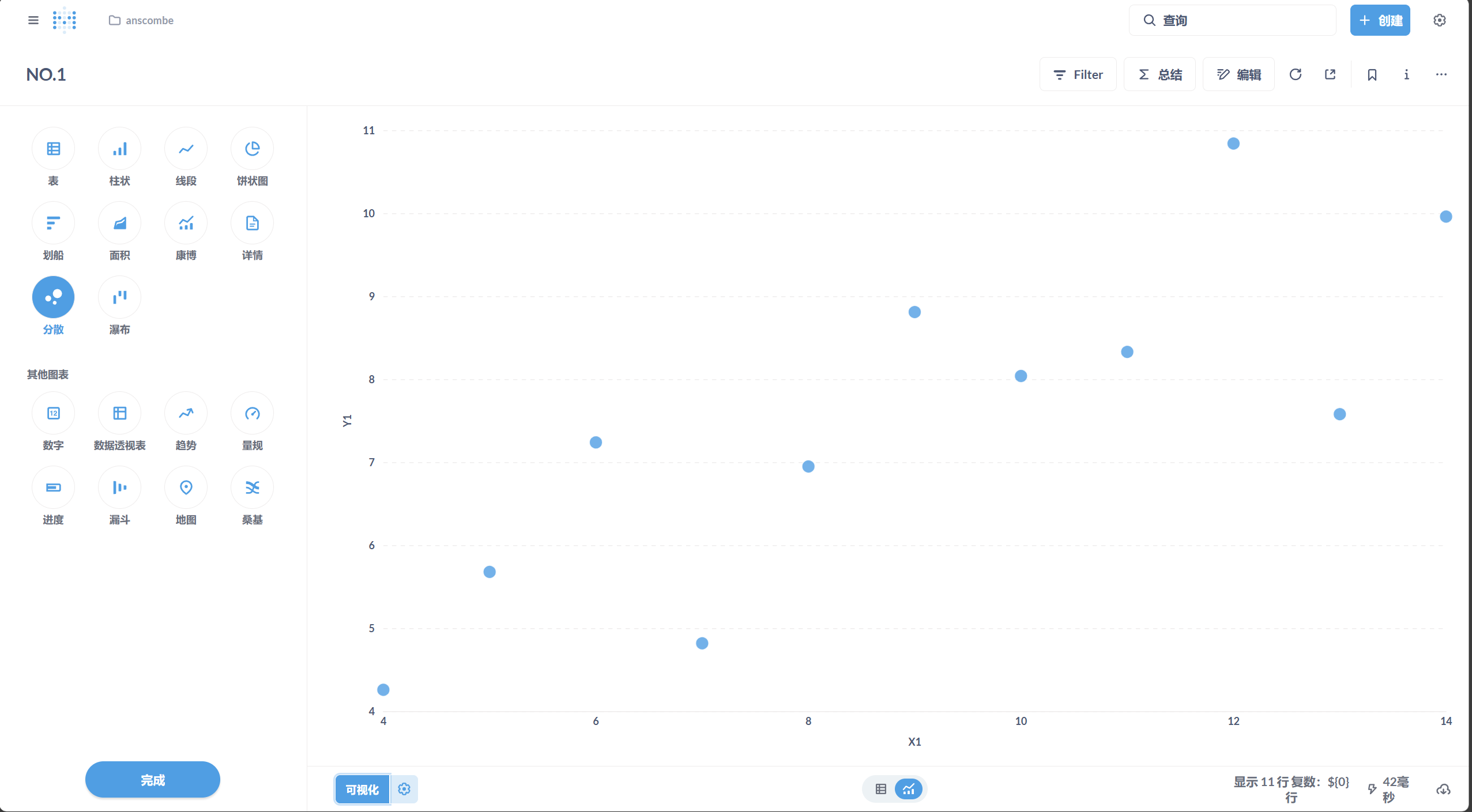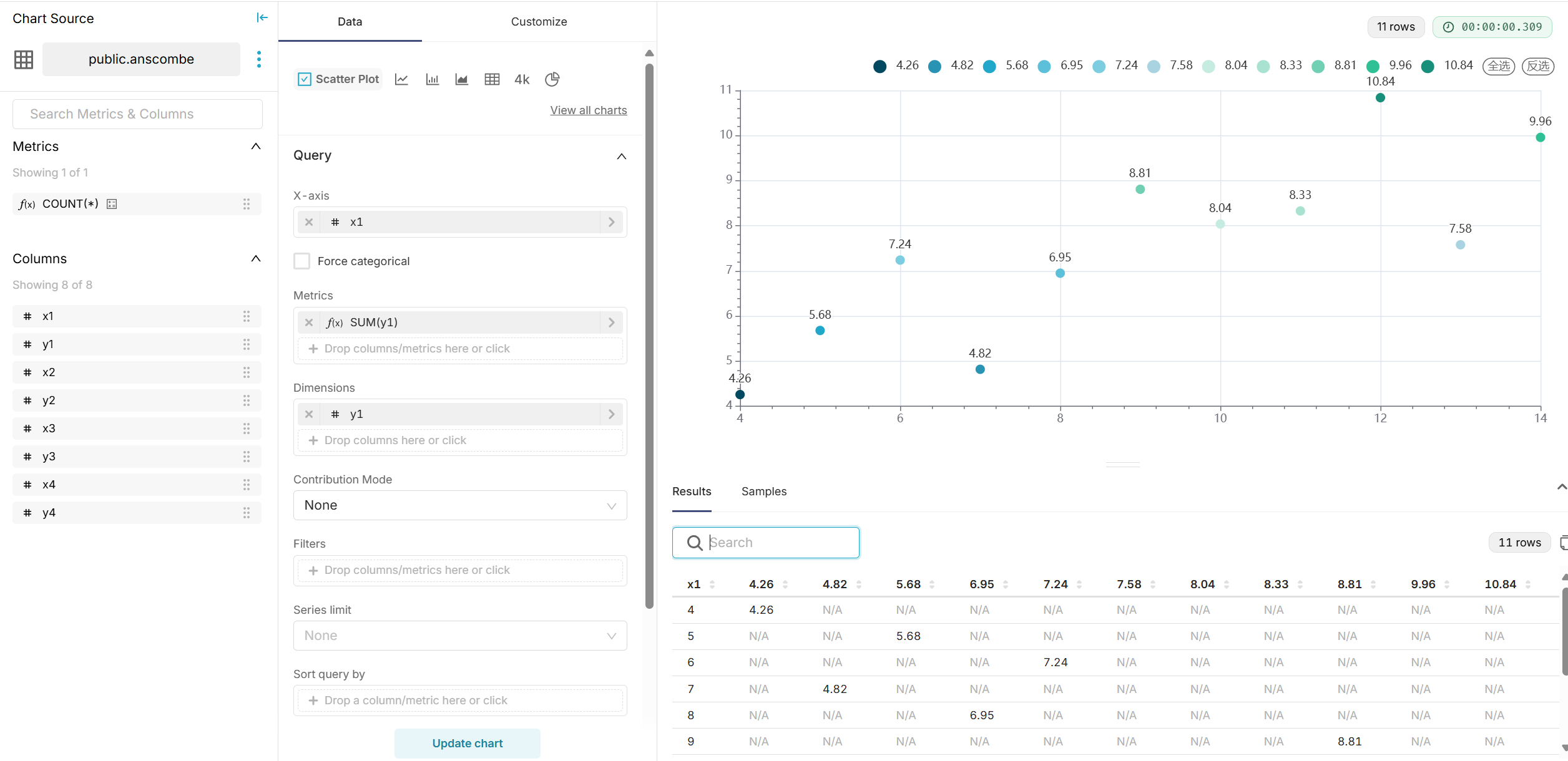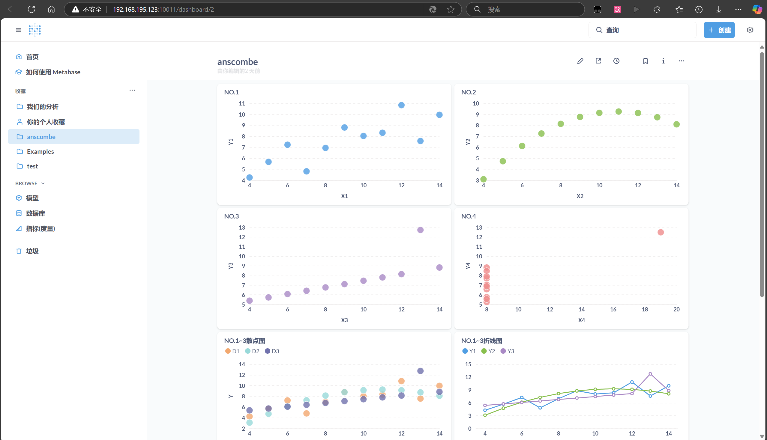 - 在 Metabase 中选择数据表,创建散点图,分别展示四组数据的分布。