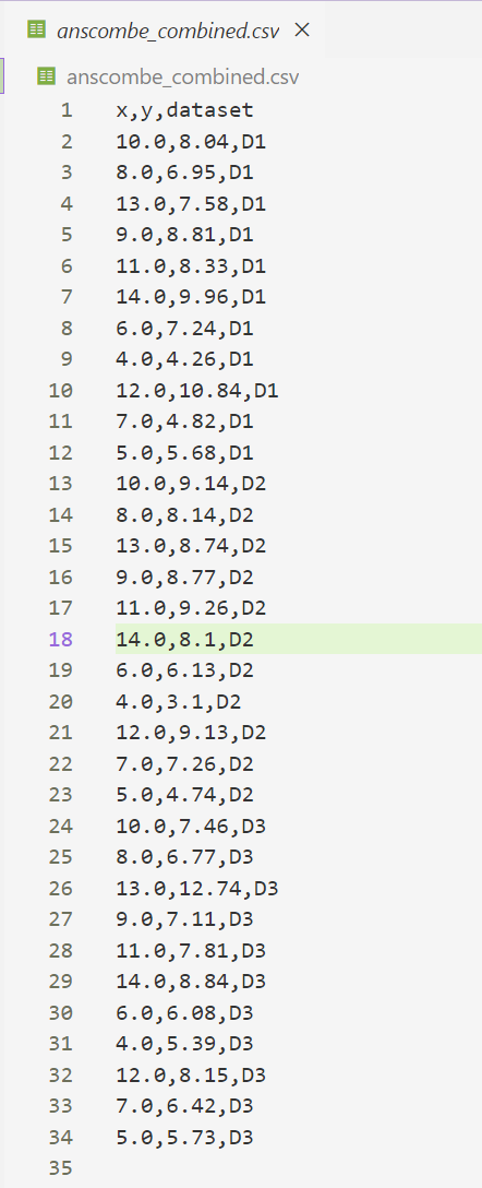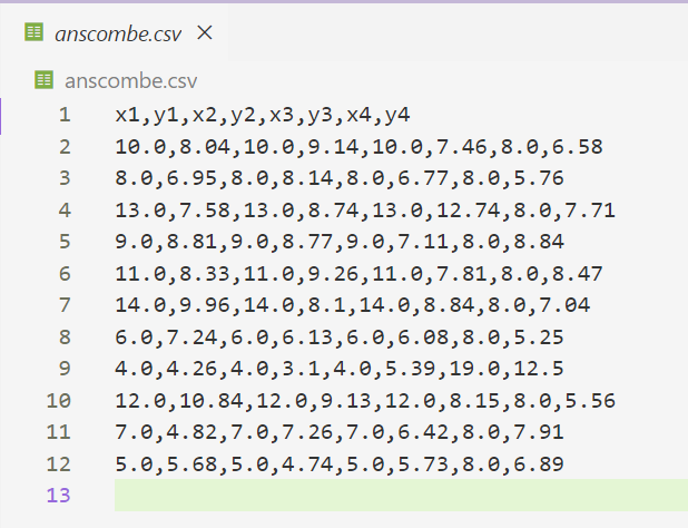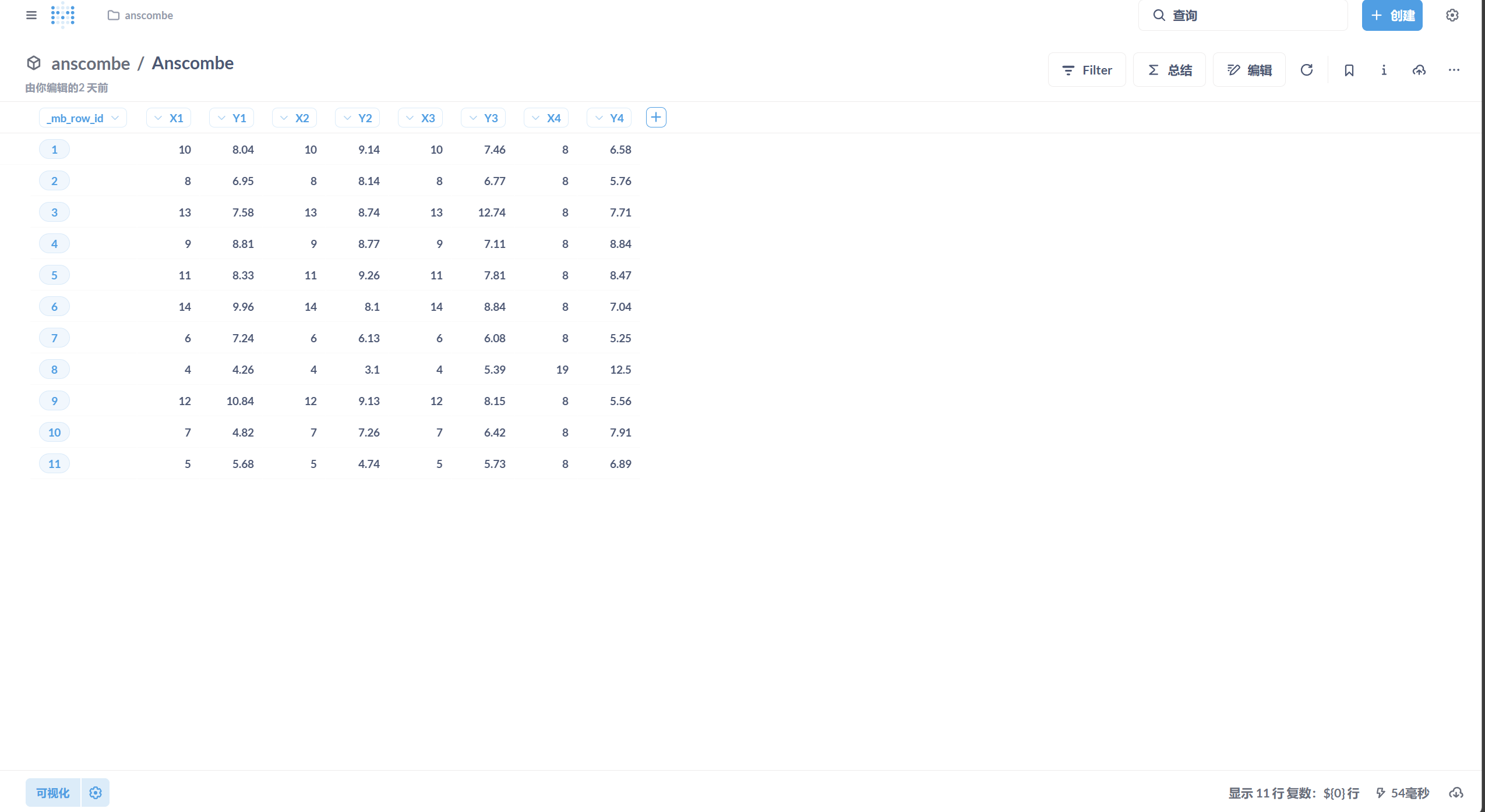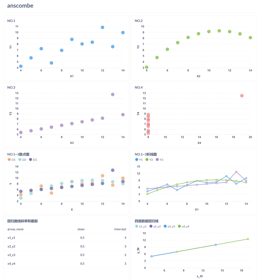 Anscombe 数据集(Anscombe’s Quartet)由统计学家 Francis Anscombe 于 1973 年提出,包含四组数据,每组的均值、方差和相关系数几乎相同,但通过可视化却呈现出截然不同的分布形态。这强调了单纯依赖统计指标的局限性,以及数据可视化的必要性。本文将使用 Superset 和 Metabase 两款工具对 Anscombe 数据集进行可视化和最小二乘法回归分析,同时记录尝试使用 Redash 的过程及其放弃原因。