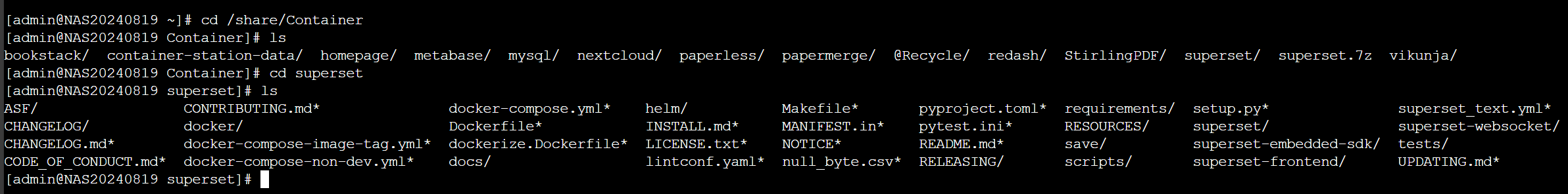 - 在目标目录下克隆 GitHub 上的 Superset 仓库(git clone https://github.com/apache/superset.git)。