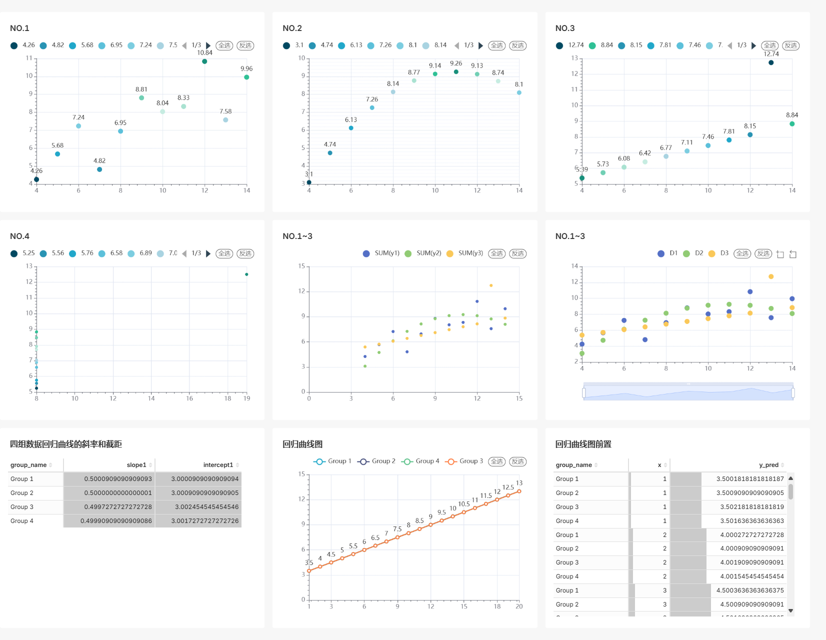 - 每组的回归直线均为 $y = 3.0 + 0.5x$